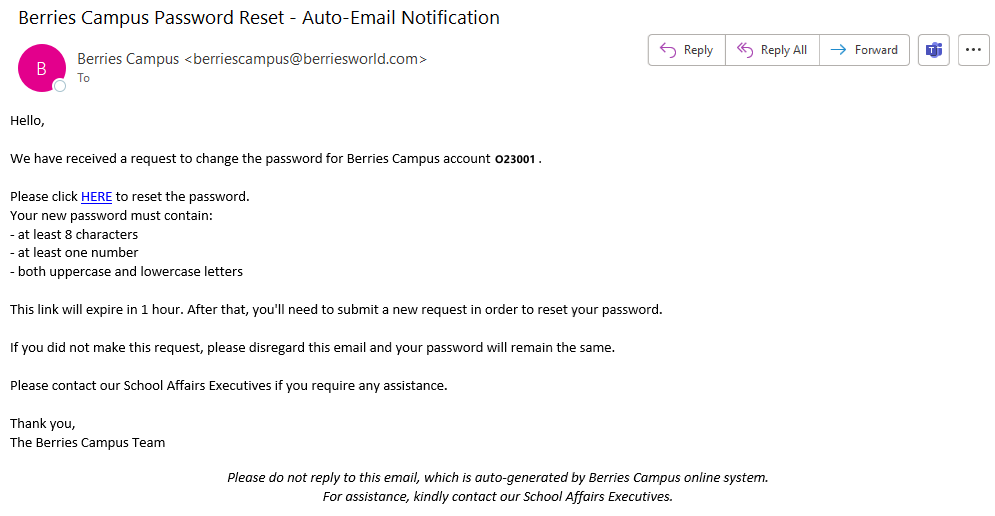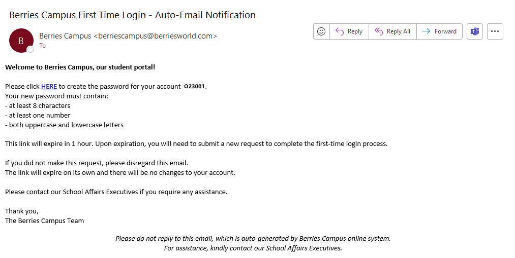 A5: If you receive this message, it is because an email address has not been provided to Berries previously. Please contact our School Affairs Executives to add a primary email address.